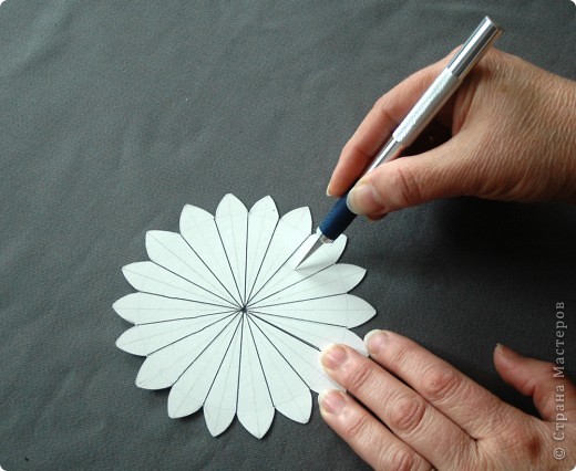 Перед началом основной работы, нужно подготовить трафареты для вырезания. Делают их при помощи распечатки на принтере или рисуют самостоятельно. Если рисовать сложно, а принтера под рукой нет, то можно сделать ромашку по схеме: