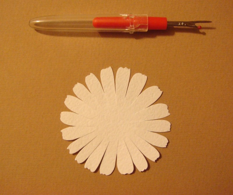 На полосках с оной стороны делаем бахрому, на каждом лепестке обработайте.