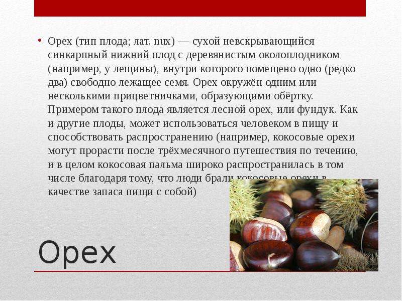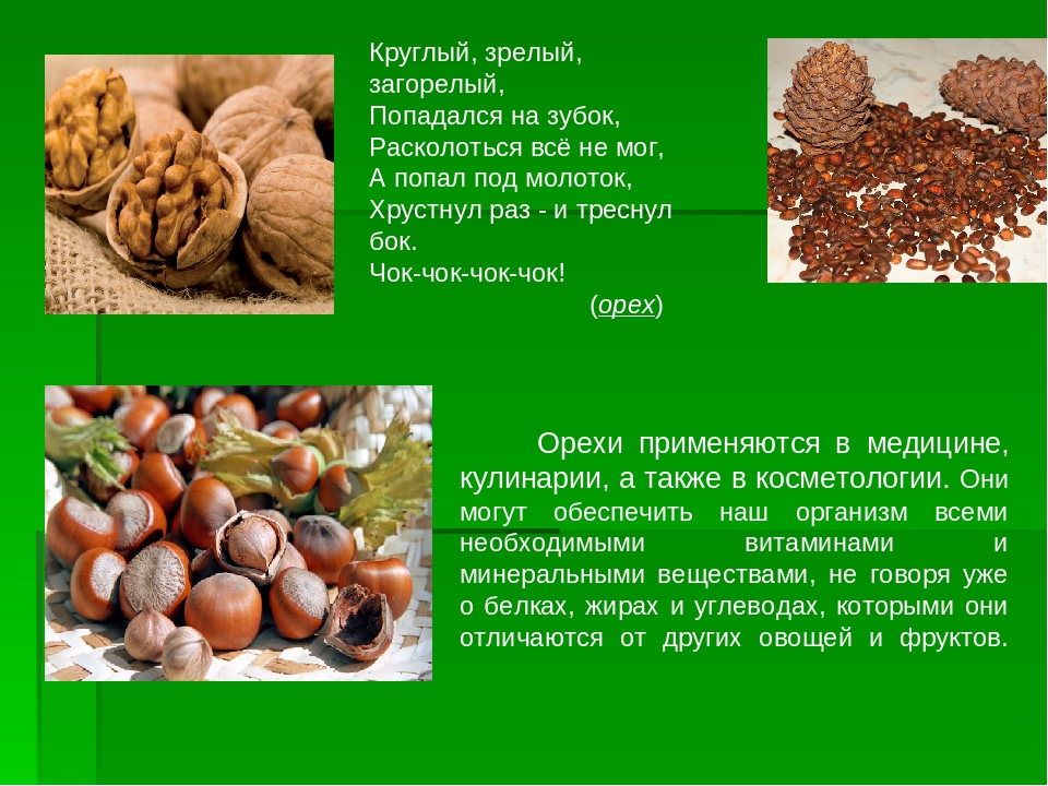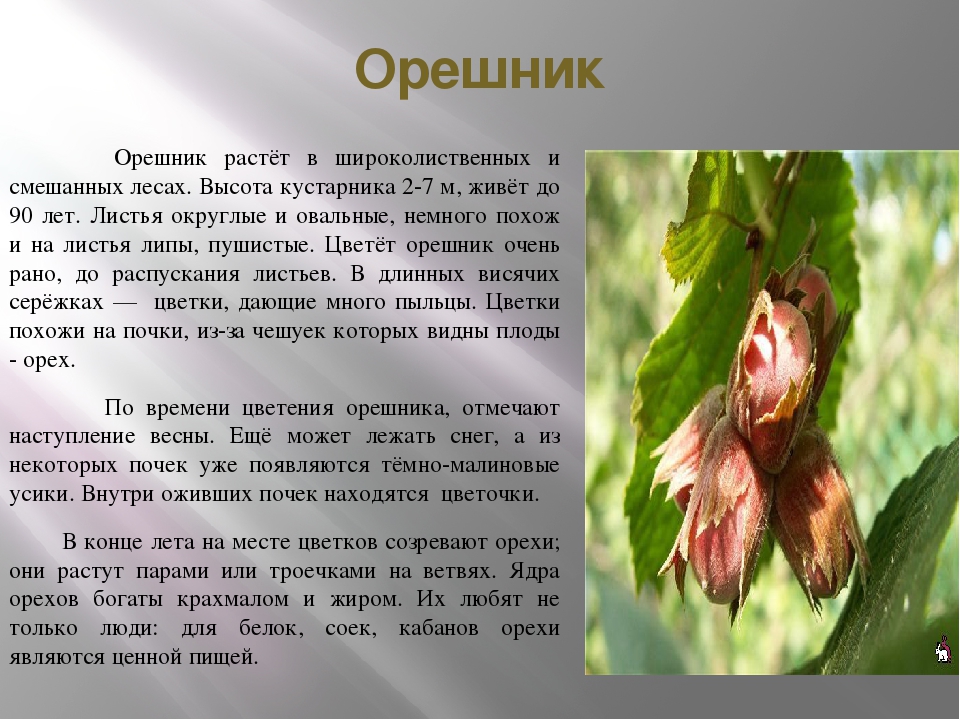 1. Да какой орех! 2. Всем орехам орех! 3. В лесу рос куст орешника. 4. Сам круглый, бока золотистые, сверху светлая шапочка набекре́нь. 5. Листья у орешника крупные, бархатистые, ветви длинные, гибкие. 6. Вот из-под листика большой орех выглядывает. 7. К осени на ветках орешки созрели.
