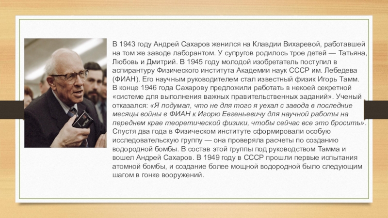 Два послевоенных десятилетия я находился в близком общении с замечательными учеными России и в их числе с Андреем Дмитриевичем Сахаровым. Многие грани нашего своеобразного существования отражены в книге А. Д. Сахарова «Воспоминания» [1], а также в мемуарах В. А. Цукермана и З. М. Азарх [2], интервью Ю. Б. Харитона в «Правде» [3] и в моем интервью «Литературной газете» [4].