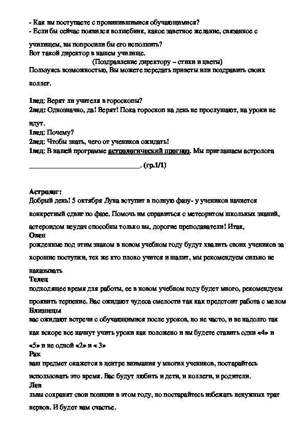 Для молодых преподавателей, в этом году впервые переступивших порог колледжа, можно отвести в сценарии на День учителя веселый номер под названием «Экзамен по педагогике». Суть номера в том, что преподаватель должен наугад «вытянуть» билет с вопросом и ответ-шпаргалку к нему, а затем зачитать их вслух. Само собой, и вопросы и ответы на «экзамене» носят шутливый юмористический характер. К примеру, на вопрос «Часто ли вы будете опаздывать на уроки?» экзаменуемый может ответить: «А почему бы и нет? Кому-то можно, а мне нельзя!». Вот несколько идей на видео, которые подойдут для составления сценария ко Дню учителя.