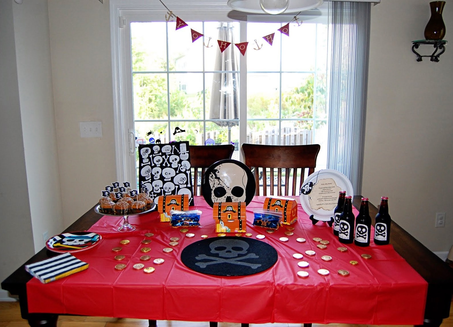 Реквизит: всё, что подходит для пиратских костюмов – тельняшки, сапоги, банданы, игрушечное оружие, переводные татуировки; ведущий закрывает один глаз чёрной повязкой, на его плече сидит попугай (пришита мягкая игрушка). Также понадобится сундучок для сокровищ.На стол: очень эффектно будет выглядеть торт в виде корабля. Если печь его самим, то бисквитные или медовые коржи вырезаются по форме, напоминающей палубу корабля, обливаются растопленным шоколадом; съедобные паруса делаются из марципана или из апельсиновых долек и крепятся с помощью деревянных палочек).