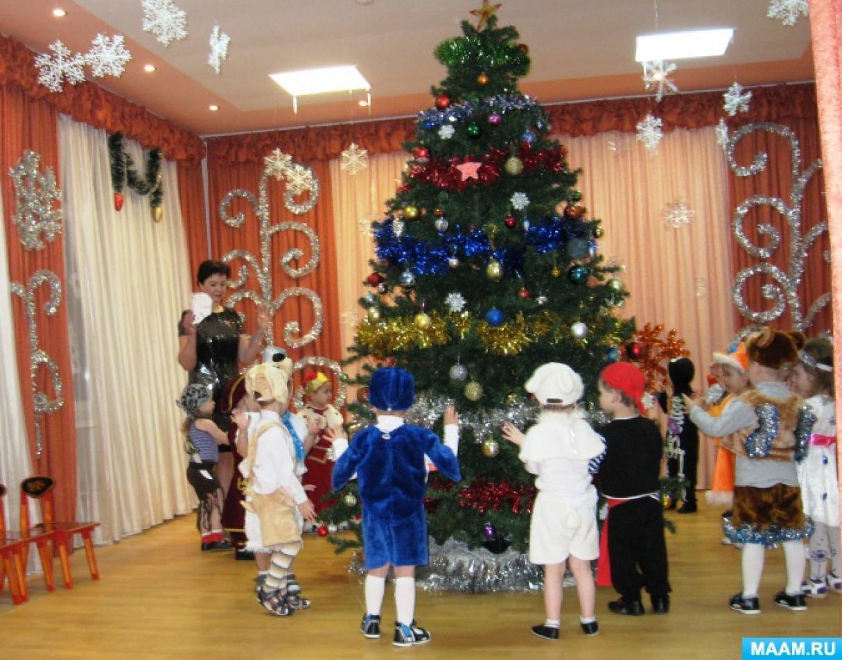Дети водят хоровод вокруг елочки, напевая песню «Маленькой елочке холодно зимой», «В лесу родилась елочка», «Елочка нарядная — множество огней» и другие разученные заранее песенки.