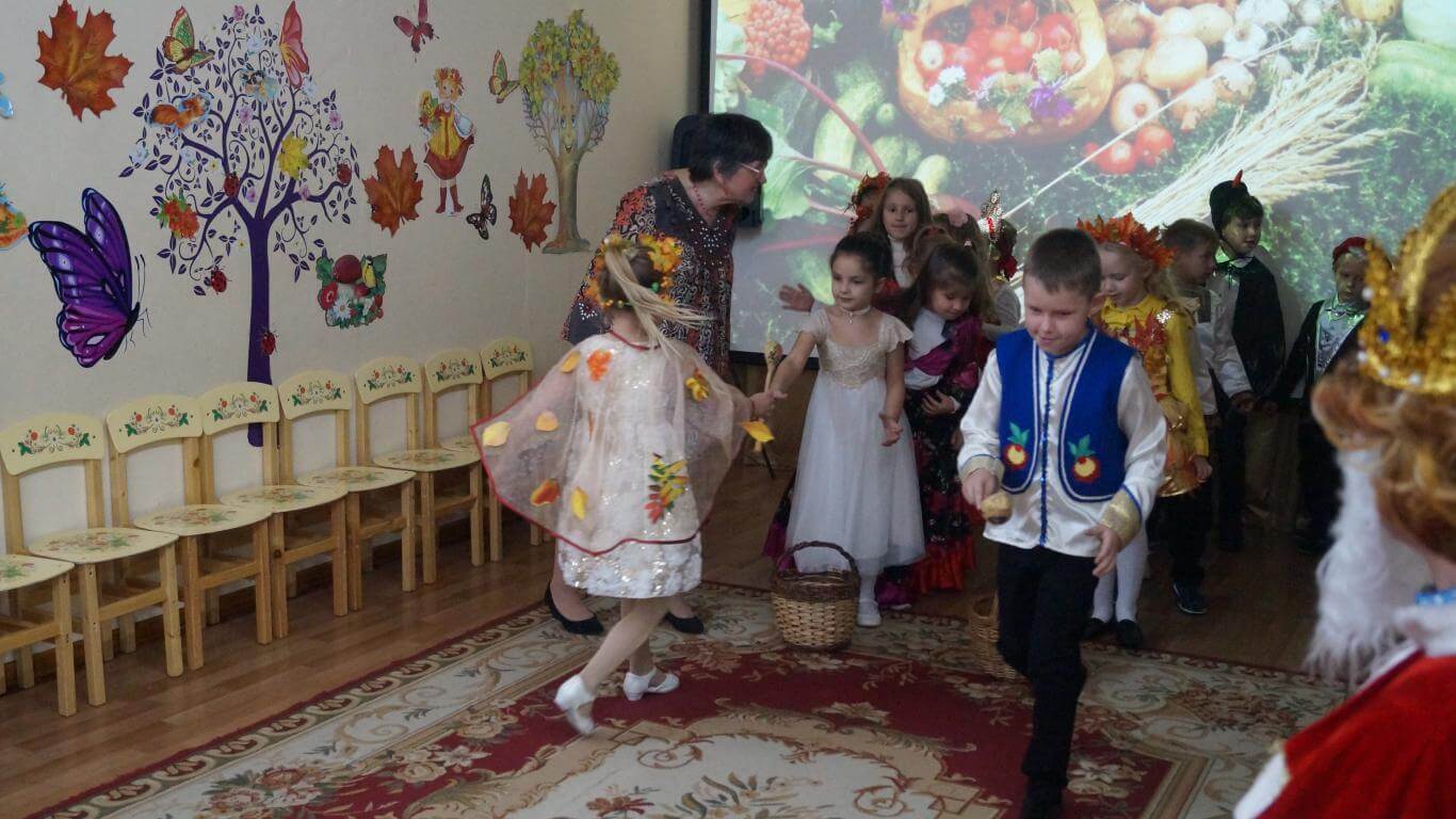 Атрибуты: детские зонтики, ленточки, русские сарафаны, разные веночки- с листиками, с фруктами, грибные шляпки, сарафаны в горох , платья для русской пляски, маленькие платочки, косоворотки, кепки, металлофон, корзинки с шишками, фруктами, сюрпризный момент — груши или конфеты.( Зал красочно оформлен , дети подготовительной группы А входят в музыкальный зал под Осенний вальс ( выполняют танцевальные движения, садятся , входят дети подготовительной группы Б с ленточками под песню «Осень раскрасавица» выполняют свои движения- садятся)