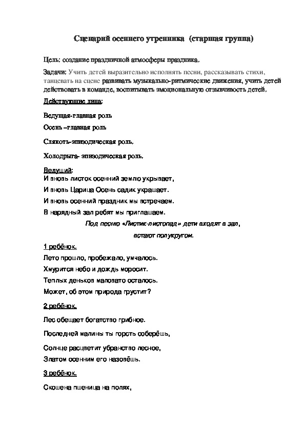 Праздник Осени – одно из самых ярких и красочных мероприятий. Дети, как никто другой, способны радоваться золотистым опавшим листьям под ногами и дождику, под которым так весело и интересно гулять под зонтиком.