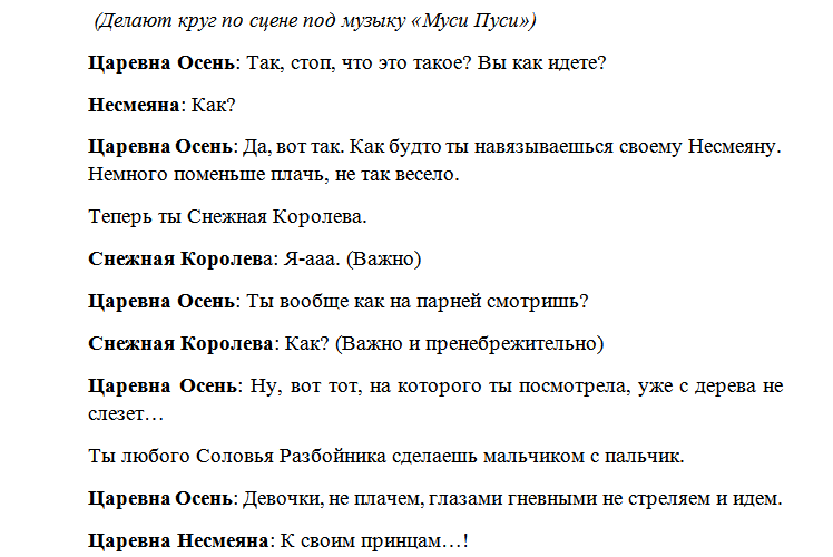 2. Ага, действует. Дай я попробую. Мисс Осень должна знать… Таблицу умножения (пауза – одна уходит) и.. законы Ньютона (все уходят кроме 2)