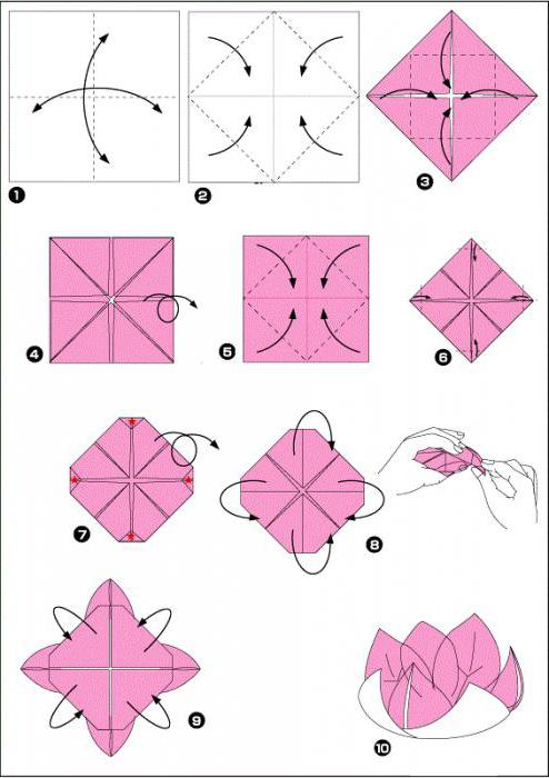 Можно весь процесс сборки оригами-цветка мак разделить на 10 ступеней, которые указаны ниже.
