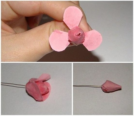Наматываем полоску вокруг проволоки для создания основы бутона. Каждый виток необходимо смазывать клеем. Вырезаем из бумаги лепестки разных размеров и форм (см. фото) и приклеиваем их к основе. Клей используем только снизу лепестка.