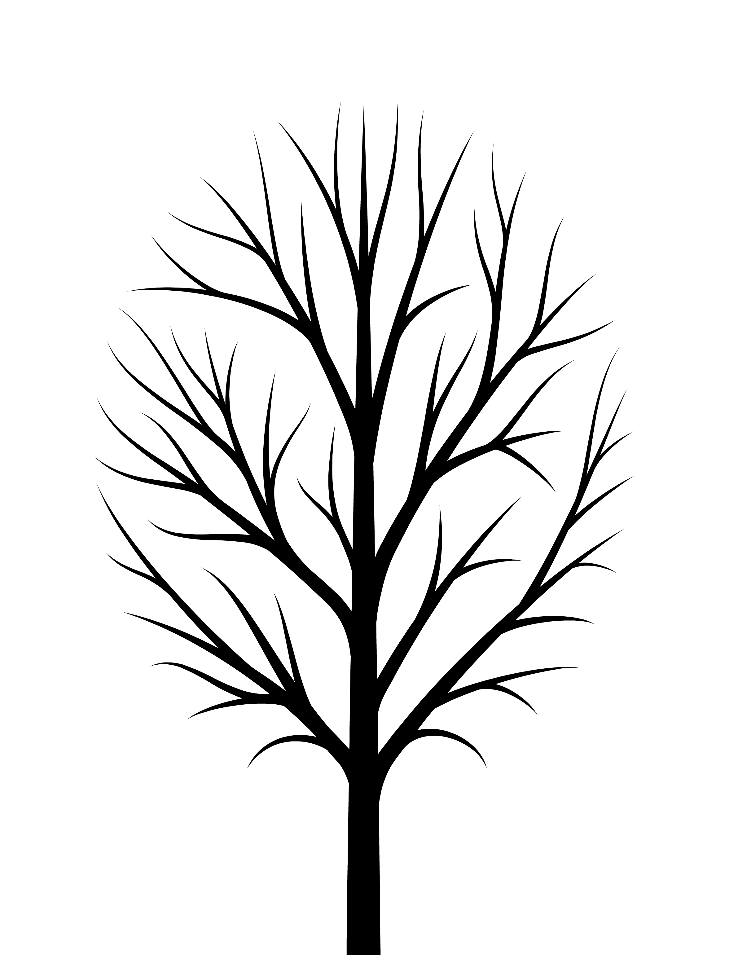 А вот шаблон дерева с тонкими изогнутыми гибкими веточками. Такой силуэт дерева у березы, ивы, рябины- у деревьев с тонкими гибкими ветвями.