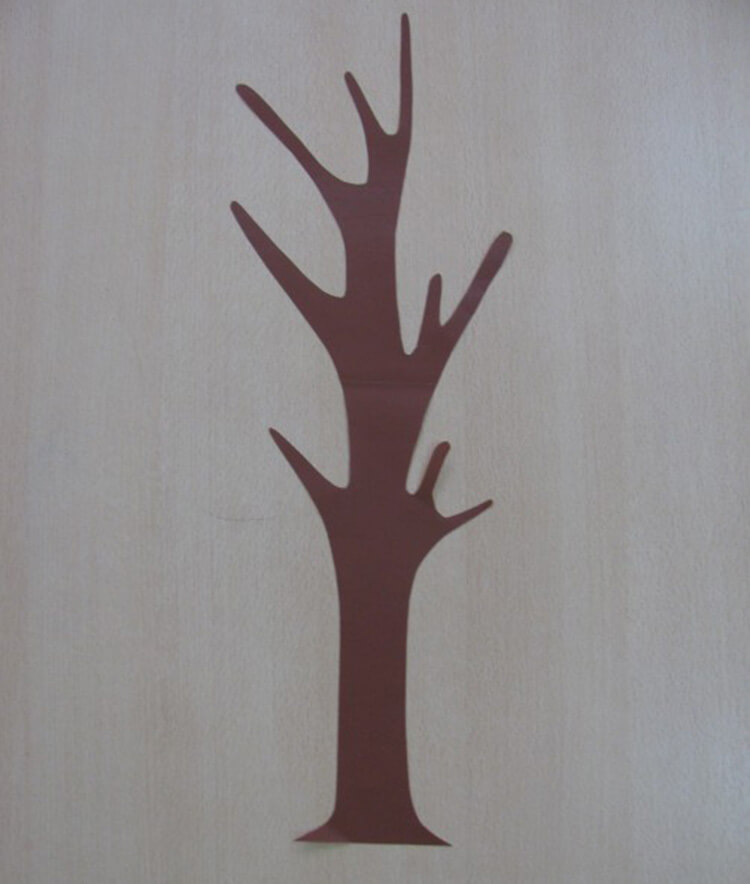 А вот классический силуэт дерева — как у каштана, липы, клена. Можно изготовить крошечные картонные штампики кленовых листочков и с помощью краски одеть такое дерево в кленовые листья.