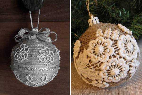 Как можно сделать красивый новогодний шар из ниток? Самый простой и быстрый способ — обмотать старый ёлочный шарик толстой ниткой для вязания или шпагатом. Используйте клей, чтобы нить надежно держалась. Результат дополните кружевом, лентами и бусинами. Новогодние шары своими руками из ниток будут смотреться на ёлке очень винтажно и романтично.