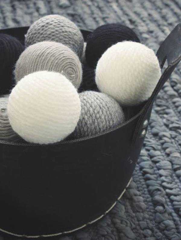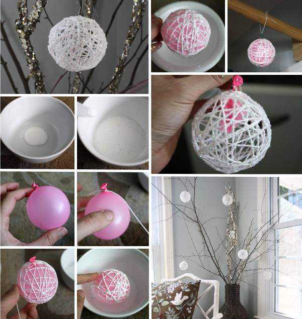Из таких же толстых ниток вы можете сделать новогодние шары своими руками в стиле эко. Всё, что вам для этого понадобится, — это клей или клейстер, несколько воздушных шариков и шпагат. Прелесть этого способа заключается в том, что вы можете как угодно украшать полученные игрушки (ветками, электронными свечами и т. д.) и придавать им любой размер. Хотите изготовить большие новогодние шары своими руками из ниток? Тогда просто надуйте посильнее!