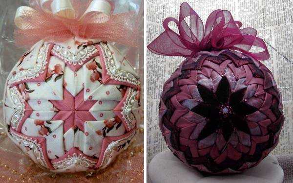 Есть несколько видов шариков, которые можно сделать самостоятельно. В преддверии Нового Года можно сделать оригинальное украшение – новогодние шары из лент своими руками. В качестве декора можно использовать розовые розы. Причем цветовая палитра выбрана не случайно. Символом 2019 года станет желтый Кабан.