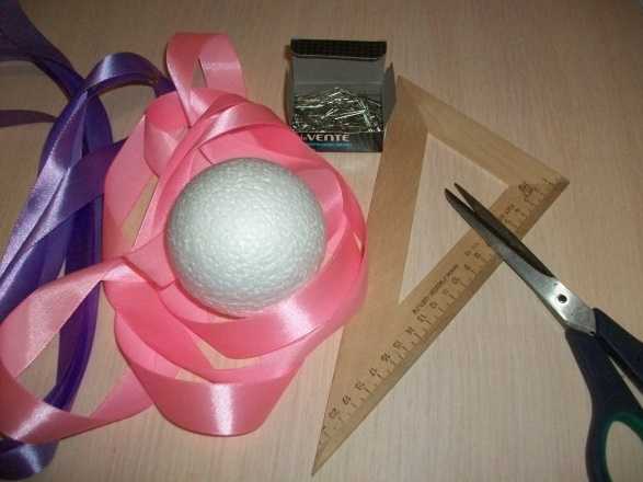 Для воплощения идеи понадобятся пенопластовая основа (продаются в магазинах по рукоделию), атласные ленты из двух цветов (оптимальная ширина 2,5 см), тесьма серебристого цвета с шириной 2 см, ножницы и булавочки – гвоздики с маленькой шляпкой.