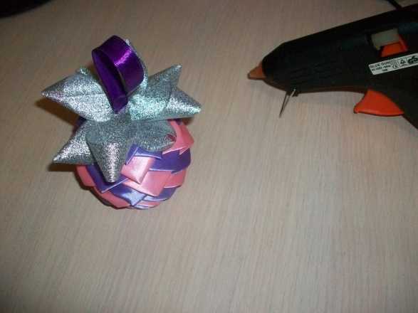 В конце шара необходимо сделать подвеску из темно – фиолетовой ленты, примерно шириной 1 см и длиной 15 см. И заклеивается лента с помощью термопистолета в основание шара.