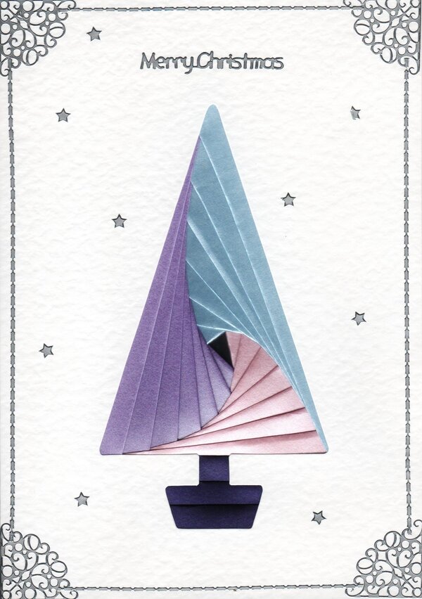 Название этой техники – айрис фолдинг – можно перевести как «радужное складывание». Рисунок заполняется тонкими бумажными полосками, которые, накладываясь друг на друга под определённым углом, создают интересный эффект закручивающейся спирали.Для выполнения ёлочки тебе понадобится лист цветного картона или плотной бумаги, тонкая цветная бумага трёх разных цветов (она может быть однотонная или пёстрая), айрис-шаблон на основе треугольника, который можно построить самостоятельно или распечатать уже готовый. Для приклеивания используй клеящий карандаш.