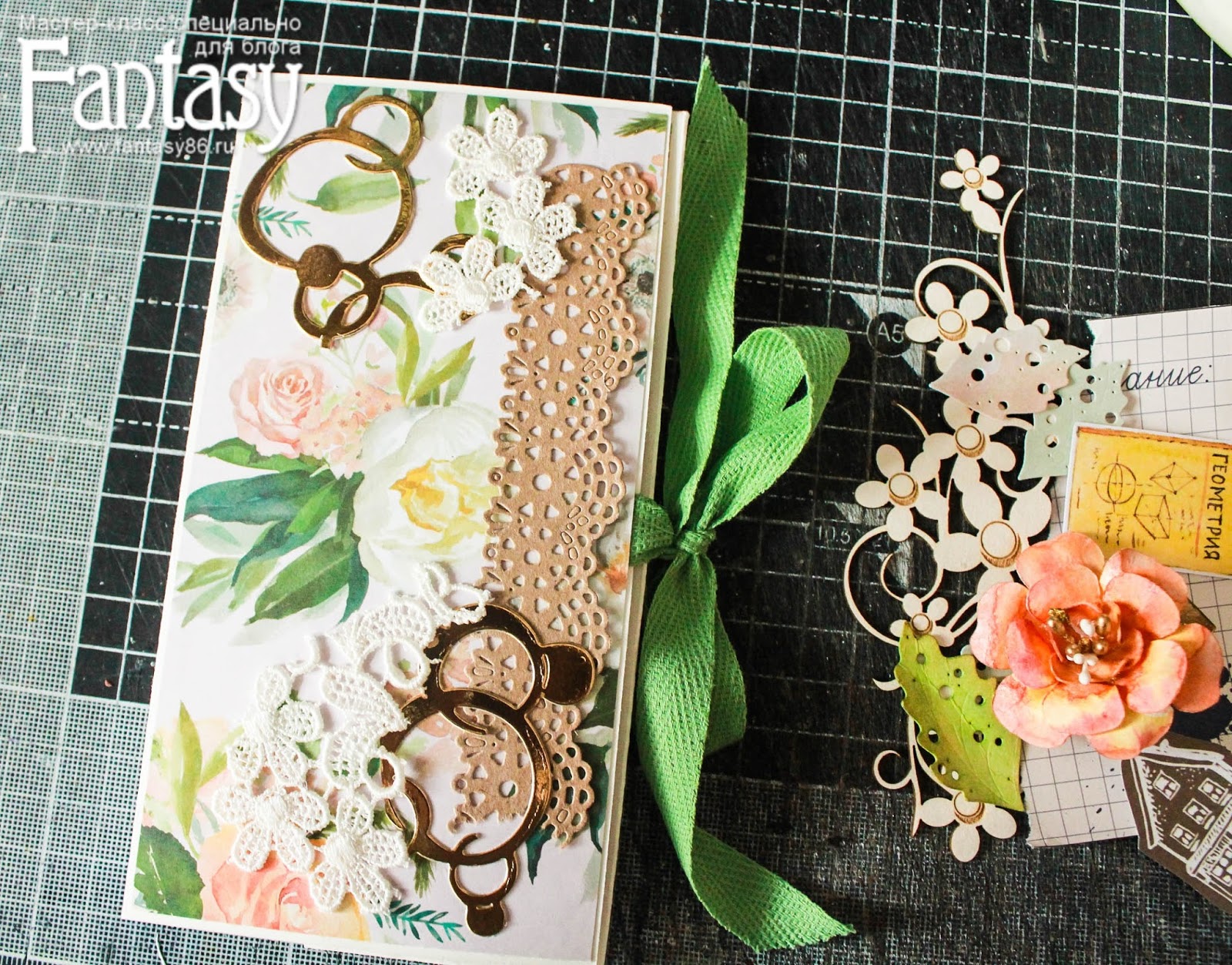 При изготовлении этой открытки Оля использовала интересный приём — и резной мотив, и 2 слоя подложки были прикреплены двусторонним скотчем на вспененной основе. Открытка, украшенная таким объёмным декоративным элементом приобрела особый шарм.