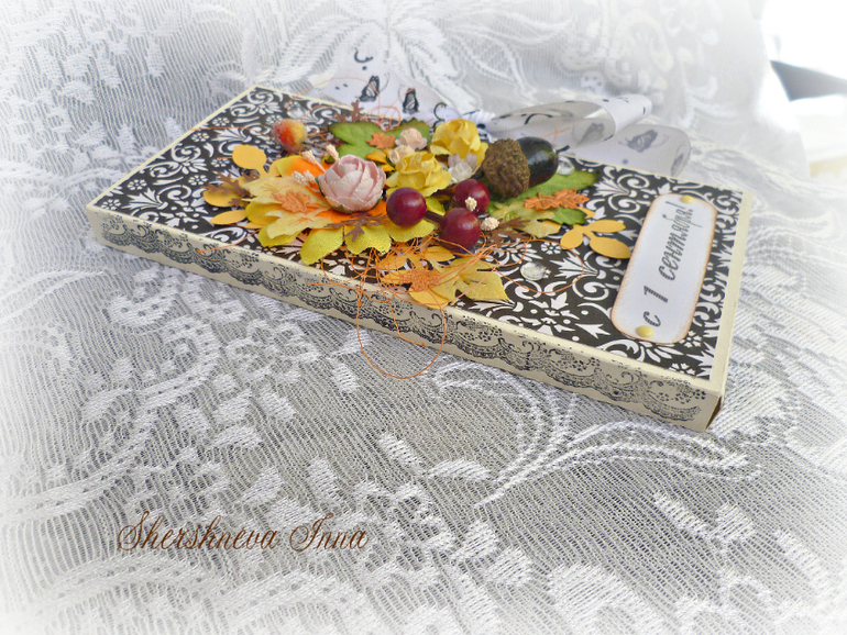 Бумагой для скрапбукинга обклейте торцы шоколадницы.