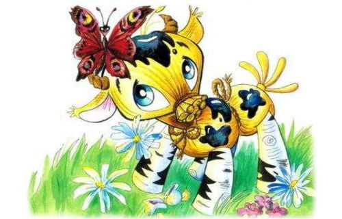 Жили-были дедушка да бабушка. Была у них внучка Танюшка. Сидели они как-то раз у своего дома, а мимо пастух стадо коров гонит. Коровы всякие: и рыжие, и пестрые, и черные, и белые. А с одной коровой рядом бежал бычок — черненький, маленький. Где припрыгнет, где прискачет.Очень хороший бычок. Танюшка и говорит: