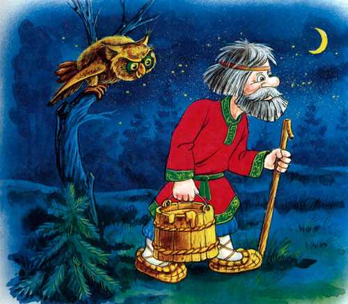 Вот настала ночь. Бабка легла спать, Танюшка легла спать, кошка легла спать, собака легла спать, куры легли спать, только дедушка не лег. Собрался потихоньку, пошел в лес.
