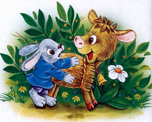 Ходит по лужку, травку ест, хвостиком мух отгоняет. Вдруг выскочил из лесу зайчик-побегайчик. Смотрит на бычка — удивляется: что это за бычок здесь гуляет. Подбежал к нему, тронул лапкой — и прилип.