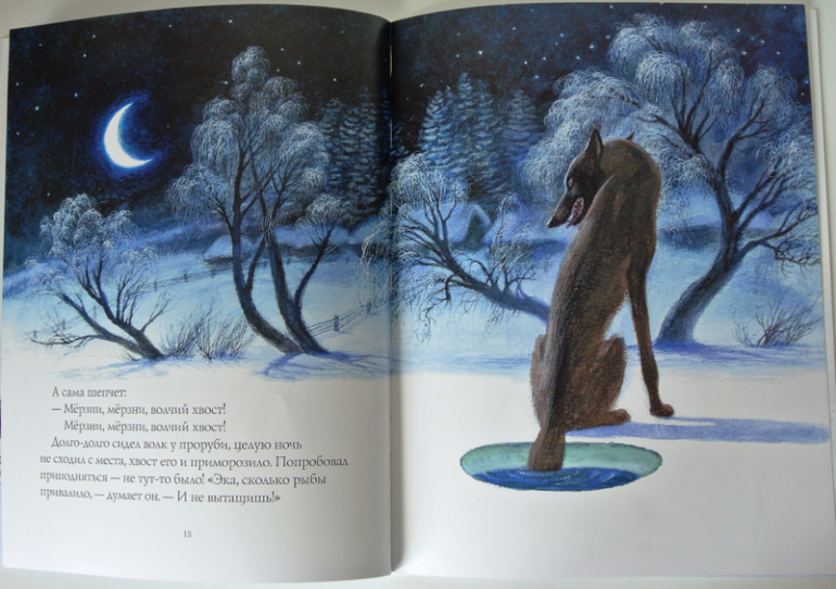— Эка, ведь я же наловила; ты, куманек, ступай на реку, опусти хвост в прорубь — рыба сама на хвост нацепляется, да смотри, сиди подольше, а то не наловишь.