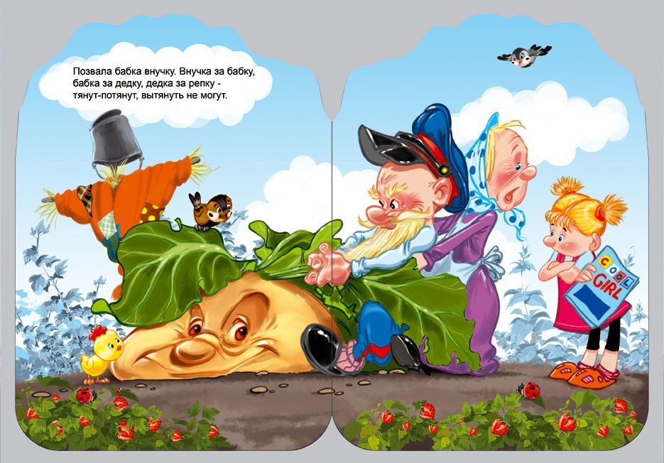 Кликнула бабка свою внученьку. Прибежала внучка, стала помогать деду и бабке. Ухватились они друг за друга, поднатужились, а ничего не выходит: репка сидит крепко.
