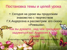 В садике цвело множество пышных, гордых цветов, и чем меньше они благоухали, тем больше важничали. Пионы так и раздували щёки — им всё хотелось стать побольше роз; да разве в величине дело? Пестрее, наряднее тюльпанов никого не было, они отлично знали это и старались держаться возможно прямее, чтобы больше бросаться в глаза. Никто из гордых цветов не замечал маленькой ромашки, росшей где-то у канавы.