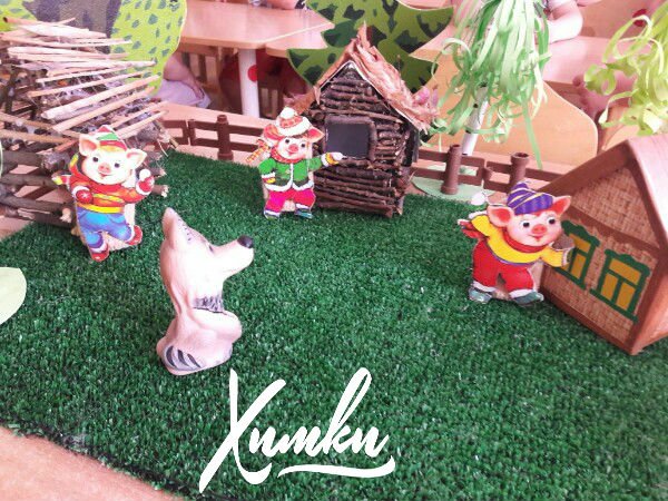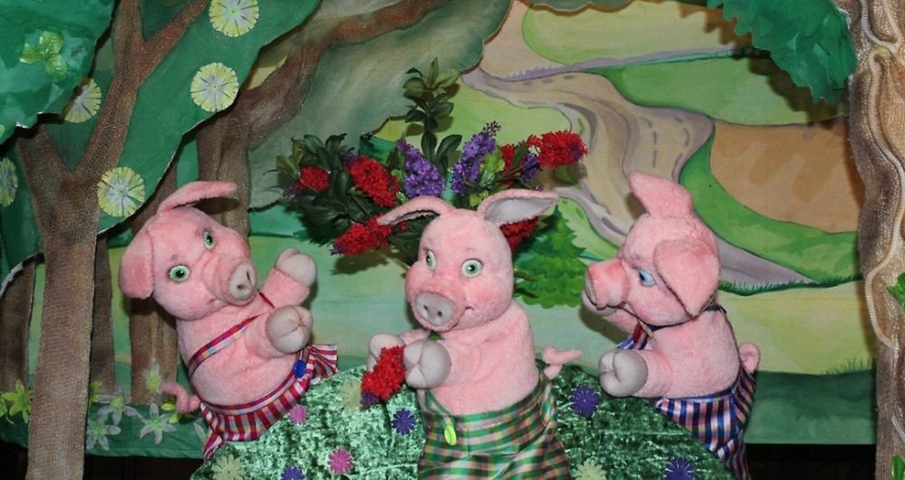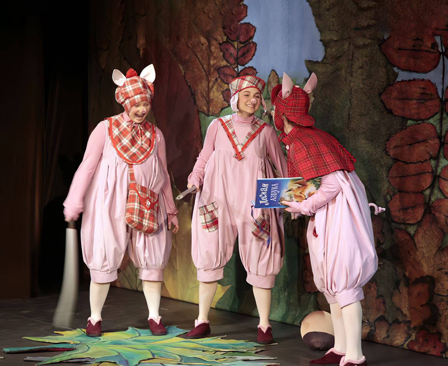 На сцене появляются три поросенка в комбинезонах и мужских рубашках в клеточку. Домик им как раз по росту.