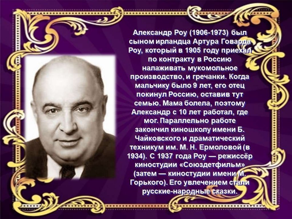 Александр Роу был сыном гречанки и ирландца Артура Говарда Роу, который в 1905 году приехал по контракту в Россию налаживать мукомольное производство. Когда мальчику было 9 лет, началась война и его отец покинул Россию, оставив семью. Мама болела, поэтому Александр с 10 лет работал, но всё-таки ухитрился доучиться, окончить киношколу имени Б. Чайковского и драматический техникум им. М. Н. Ермоловой. С 1937 года Роу — режиссёр киностудии «Союздетфильм», (затем — киностудии имени М. Горького). В 1938 году Александр Роу начал съемки сказки «По щучьему велению» — первой игровой сказки, где чудеса творили не нарисованные герои, а живые актёры. Всего Роу снял 14 волшебных фильмов-сказок. Давайте вспомним лучшие из них — может быть вам захочется пересмотреть их с детьми или внуками.