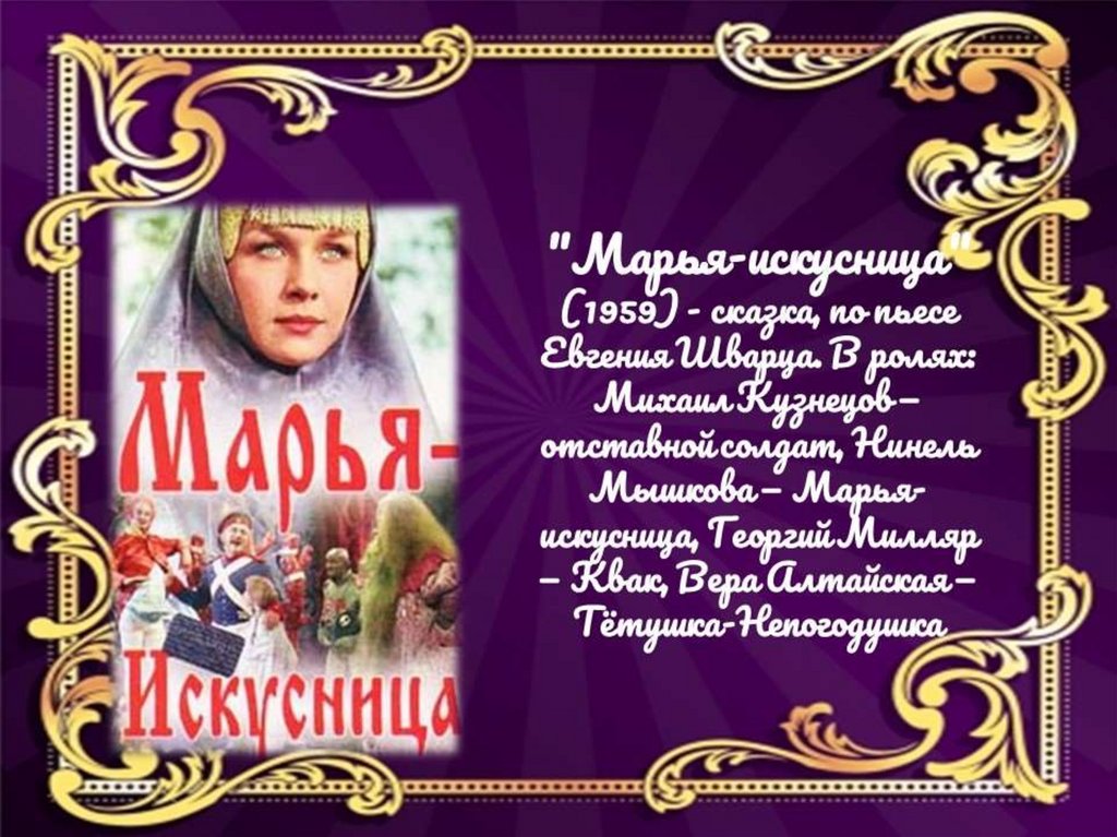 Однако в 1958 году все же на экран вышла сказка о Коте в сапогах, снятая сразу по двум произведениям – «Кот в сапогах» Шарля Перро и «Любовь к трем апельсинам» Карло Гоцци. «Марья-искусница» (1960 г.) Кадр из фильма «Марья-искусница” (1960 г.)