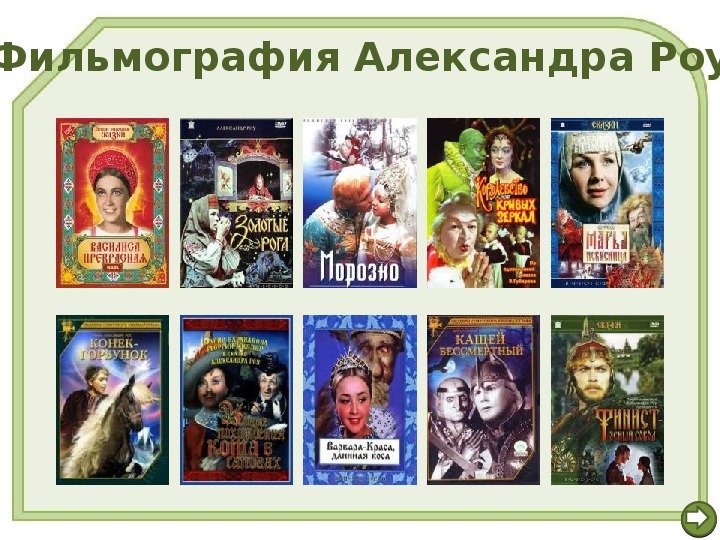 Не одно поколение детей выросло на его волшебных фильмах «Кощей Бессмертный», «Марья-искусница», «Королевство кривых зеркал», «Морозко», «Огонь, вода и медные трубы», «Варвара-краса, длинная коса», «Вечера на хуторе близ Диканьки» и др.