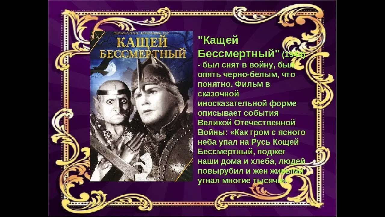 И снова, конечно же, не обошлось без Милляра. В «Василисе» он сыграл сразу три роли — отца, гусляра, а также первую в своем длинном списке Бабу-Ягу. «Кащей Бессмертный» (1945 г.) Кадр из фильма «Кащей Бессмертный» (1945 г.)
