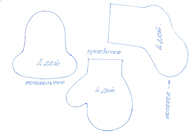 Для изготовления ручек сшиваем два кусочка флиса белого и синего цветов. Затем размечаем детали ручек на сложенном вдвое материале. Прошиваем по контуру, оставляя зазор для набивки. Вырезаем, выворачиваем и набиваем наполнителем.