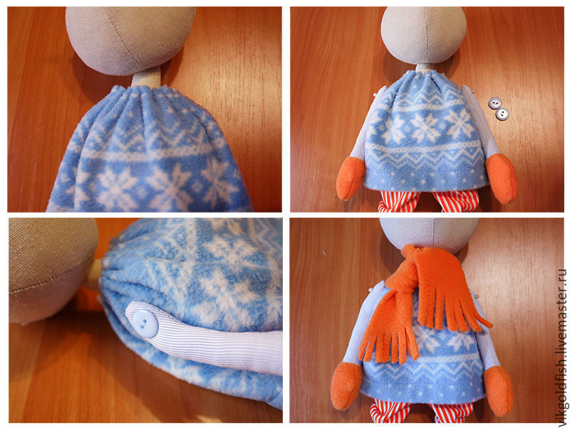 Колпак достаточно велик, что позволяет обернуть его как шарф вокруг шеи. Фиксируем это положение детали несколькими стежками. Игрушка готова!