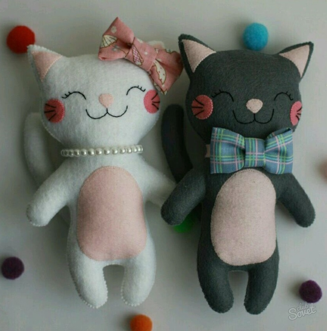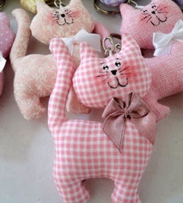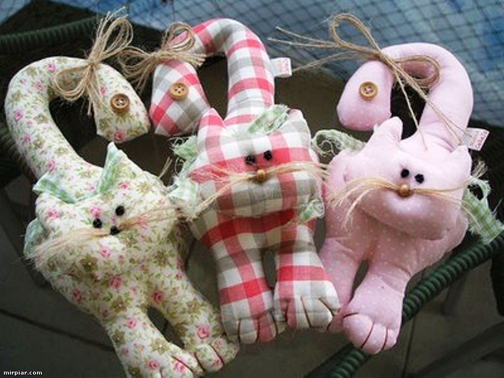 Сшей забавные игрушки из ткани, набей их ватой, синтепоном или наполнителем из старых подушек. Добавь на свое усмотрение аксессуары, например, шарфик коту или ажурный бантик для кошечки.