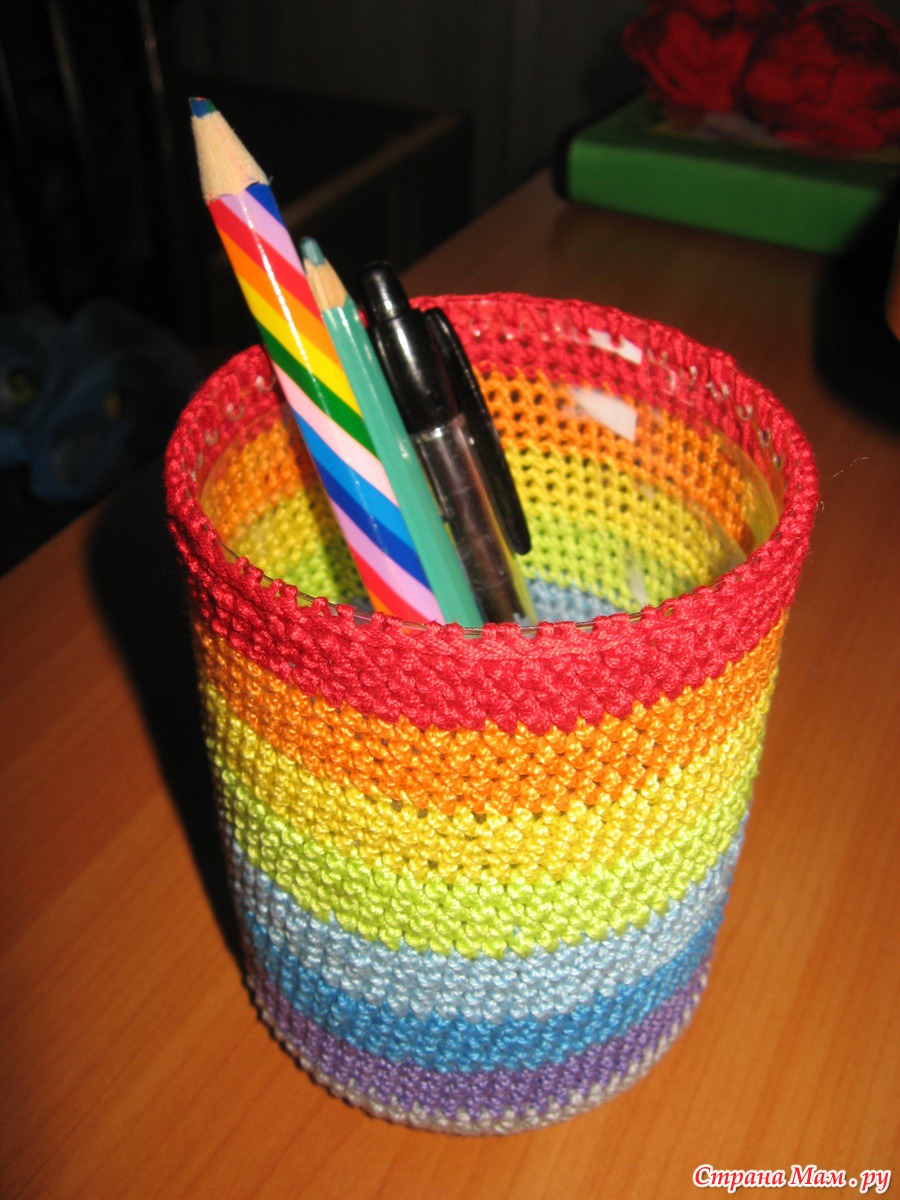 Такой стакан подходит для хранения карандашей. Кроме того, его можно использовать как вазу для искусственных цветов.