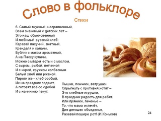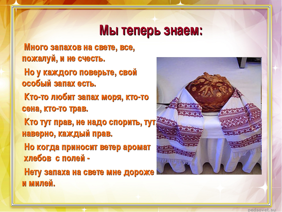 В: – Чего здесь только нет! И хлеб, и булки, и пирожные, и много другого. Все мягкое, свежее. Вот этот каравай, похоже, только сейчас вынули из печи – он еще горячий. А вы представляете, какой в булочной стоит хлебный дух, какой запах, какой аромат! Ой, ребята, а я и вправду чувствую запах хлеба.
