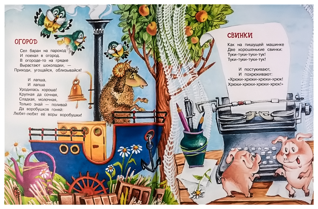 Ещё – замечательное для малышей стихотворение Сергея Козлова- “Осень”. оно длинное, мы взяли часть – закончили кротом. Но оно всё чудесное. Думали, сколько и каких картинок можно нарисовать, и текстом доказывали. Замечательно нарисованы образы – дом-паровоз, васильки с овечками,калина…