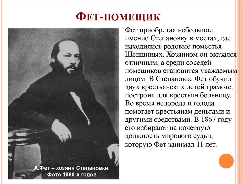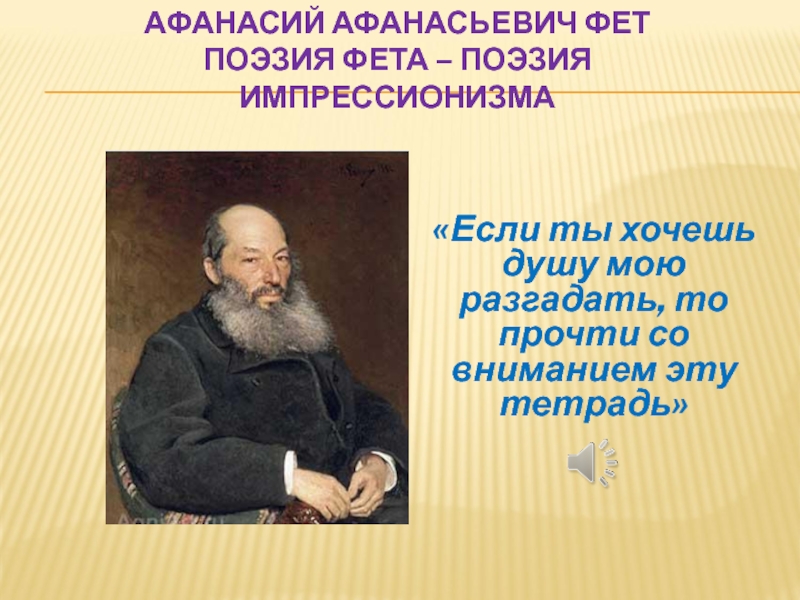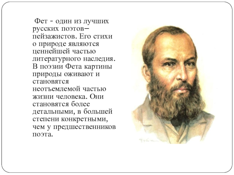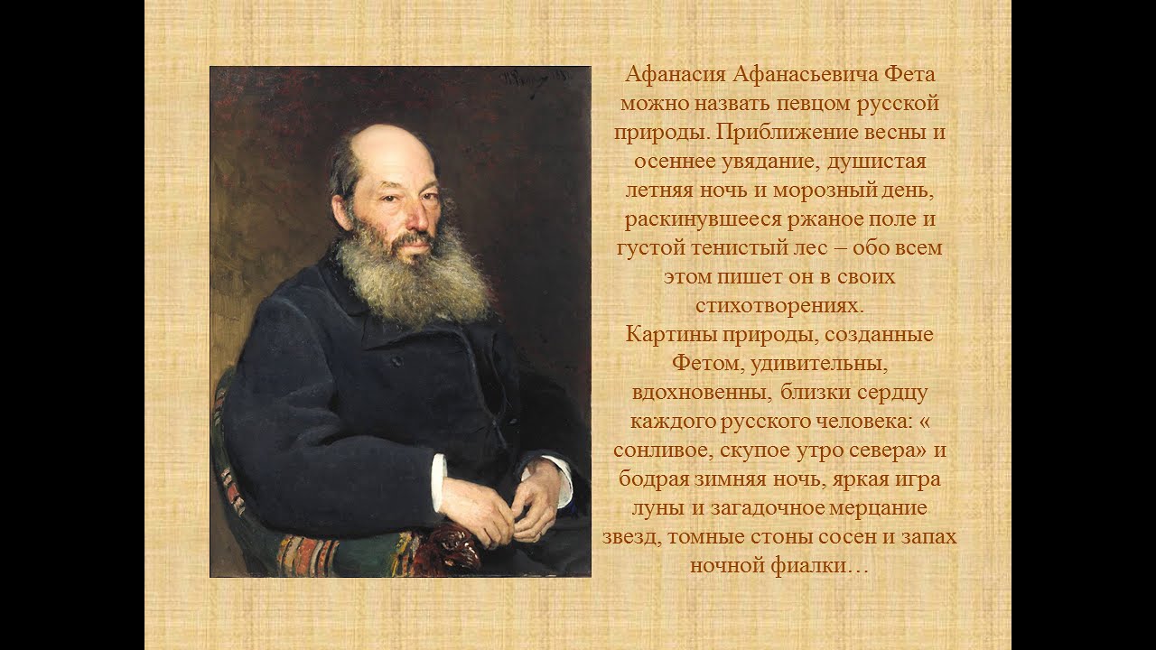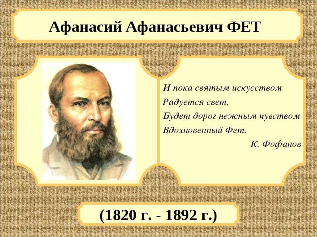Афанасий Фет – замечательный русский поэт, основоположник поэтического жанра – лирической миниатюры. Сфера его поэзии ограничена. Его поэзия — «чистая поэзия», в ней нет социальных вопросов действительности, нет гражданских мотивов.Он избрал такой стилистический прием повествования, который позволял скрыть за внешним ходом событий свою душу от читателя. Фета заботит только красота – природа и любовь. Он считает поэзию храмом искусства, а поэта – жрецом этого храма. Эти две темы поэзии Фета тесно связаны друг с другом. Фет считает, что только природа и любовь способны отразить всю красоту и очарование окружающей действительности. Характер, переживания, мысли и чувства лирического героя в поэзии Фета зависят от мироощущения поэта.