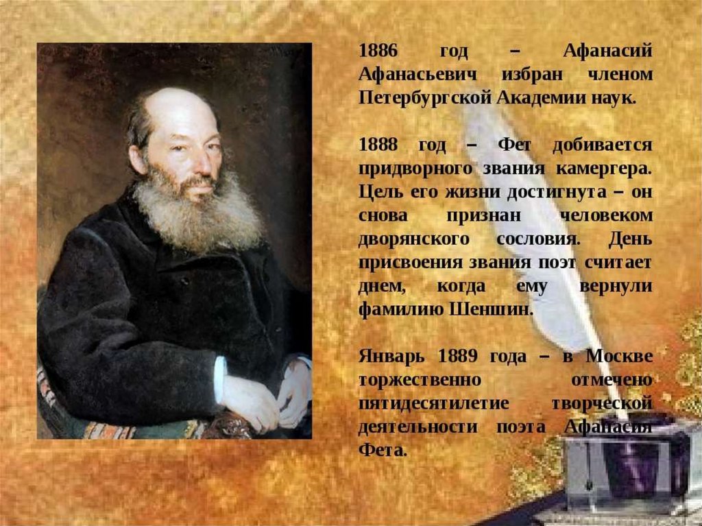 В прошлом остались любовные увлечения, поражения и победы. Фет добился благополучия и известности. Лучшие годы уже были позади, оставалось спокойно воспринимать старость, подводить итоговую черту под своей жизнью.