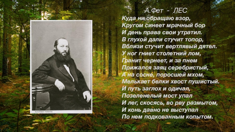 Образ лирического героя …Лирический герой оказался один в темном лесу. Его окружает царство неприступных могучих деревьев, царство тайн, загадок, пугающих теней и звуков. Герой Фета в смятении. Его привлекает этот неведомый мир в его постоянной изменчивости, непредсказуемости, в постоянной смене состояний и настроений. Его привлекает уникальность и трепетность этих моментов. Теперь все вокруг «гудит и качается».Что будет дальше? Может, через минуту все успокоится и выглянет солнце, примирит природу, принесет мир и покой в душу человека? Но давайте подумаем! Можно ли объяснить смятение героя только одиночеством и темнотой леса, только тревожным состоянием природы? Конечно, нет! Здесь, как и во всех произведениях поэта, перед нами открывается сложный и неповторимый духовный мир человека, с его загадками, тайнами, с его надеждами, ожиданиями, мечтами, с его страстями, чувствами, любовью и сомнением.Именно лирическое волнение самого автора придает глубокий смысл явлениям природы, оживляет их. Мы чувствуем, как тесно слились в единое целое мир природы и мир души человека, как живо и ярко картины и звуки природы отражают тонкие чувства героя, чувства самого автора. «Я ничего не понимаю, — говорит Фет. И эти слова относятся не к тому, что происходит вокруг, не к таинственному завю ветра, не к плотно сомкнутым ветвям ели, преградившим путь лирическому герою.Поэт рассказывает о себе, о тех противоречивых и волнующих чувствах, которые как-то вдруг, в один момент, как бы сами собой проснулись в его душе. Почему такие разные и необъяснимые эмоции переполняли душу поэта? Почему он «жуткий, грустный и веселый» одновременно? Наверное, потому, что он каким-то странным образом предчувствует скорую перемену не только в недоступном темном царстве леса, но и в своей судьбе. Лирический герой живет в постоянном ожидании. Сам автор постоянно живет в ожидании чуда, волшебства, счастья, любви.