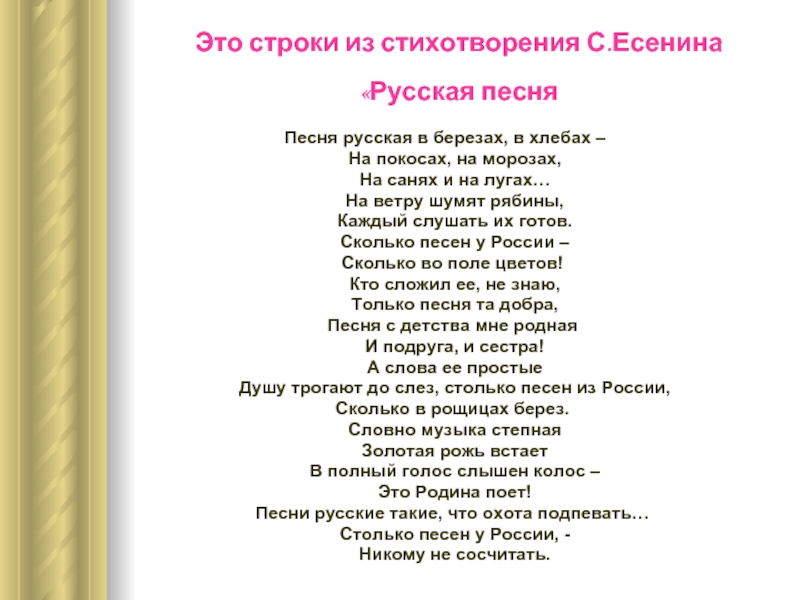 Это произведение 1866 года представляет собой очень простое стихотворение, состоящее всего из четырех строк, первый экземпляр которого был написан на листе макулатуры.Тем не менее, эти четыре строчки умело суммируют настроения россиян. Стихотворение остается популярным до сих пор и недавно было прочитано вслух президентом Путиным экс-президенту Франции Николя Саркози.