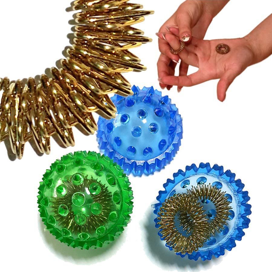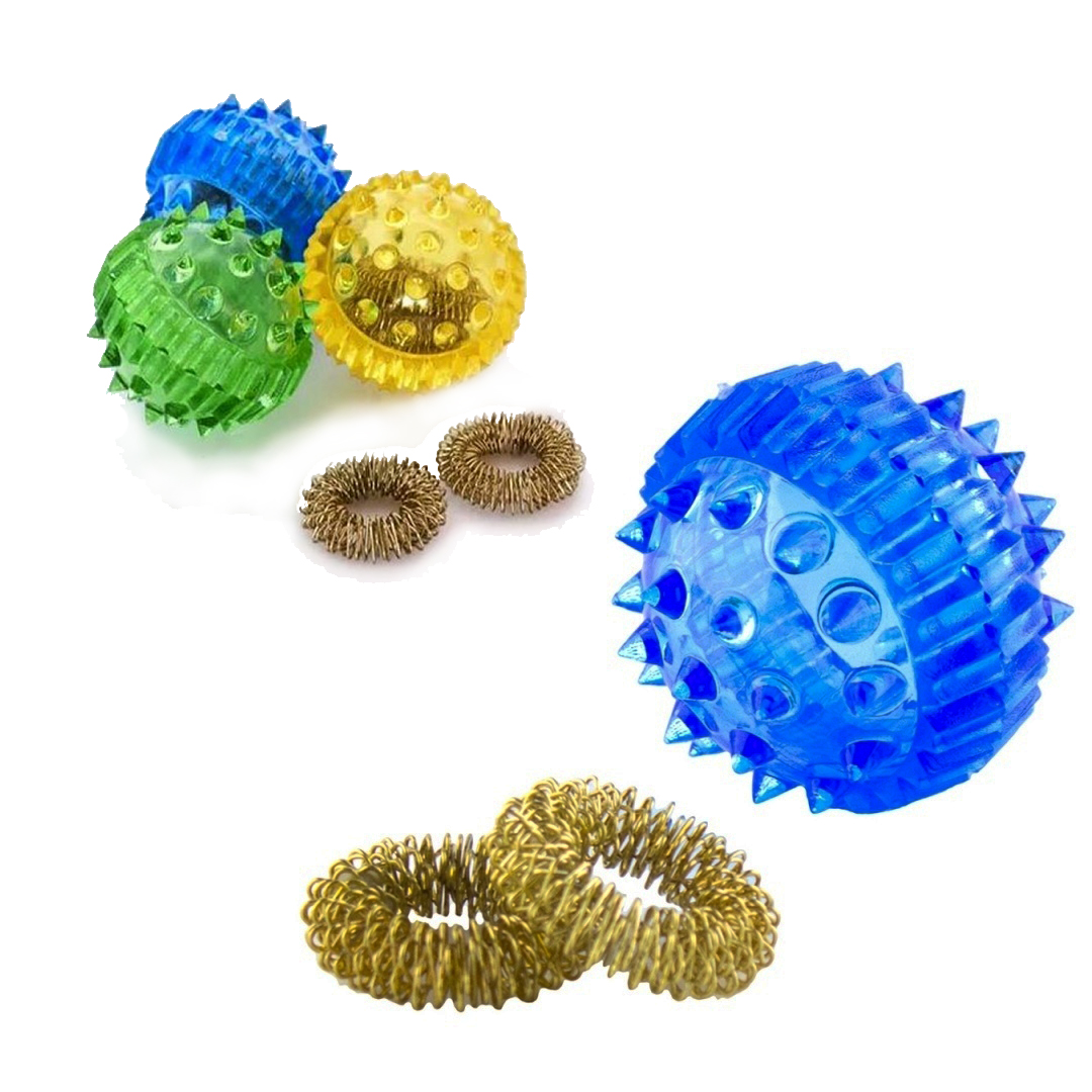 В своей практике мы применяем Су Джок массажеры в виде массажерных шариков в комплекте с массажными металлическими кольцами.