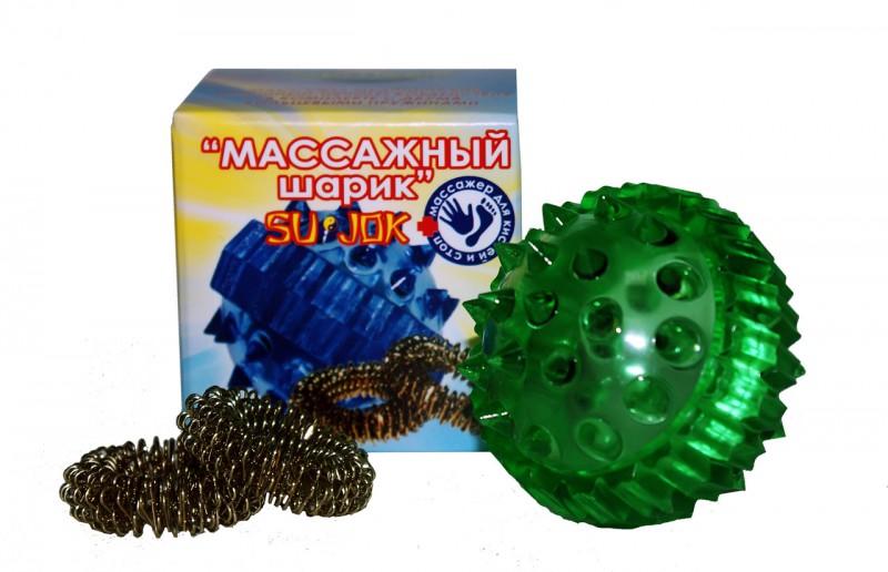 Кроме того, этот метод развивает малый мотоцикл. Традиционная пальчиковая гимнастика вызывает возбуждение локальных станций мозга, а Су-Джок Массажер – это уникальная тактильная гимнастика, которая тотально воздействует на кору головного мозга, защищая ее отдельные зоны от переутомления, равномерно распределяя нагрузку на мозг. .Су-Джок терапия проводится специальным медицинским мячом с колючками и пластиковыми шипами, внутри которых находятся два массажных кольца. Массажные шарики бывают разных цветов. Внутри массажера есть две кольцевые пружины. Кольцо сделано из металлической проволоки, так что, растягиваясь, может беспрепятственно проходить на пальце вверх и вниз. Это позволяет производить быструю стимуляцию набора точек по окружности пальца.