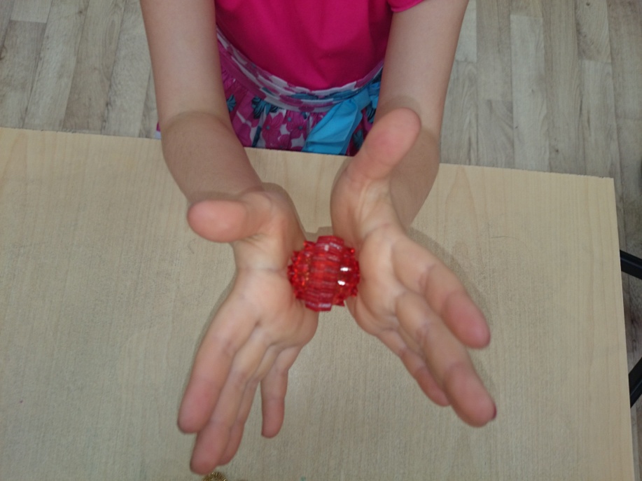 – вдавливание шарика в кулачок от 5 до 10 раз, затем раскрытие ладони полностью полностью, собирая пальцы в стороны, удерживая в центре ладони 5-10 с.