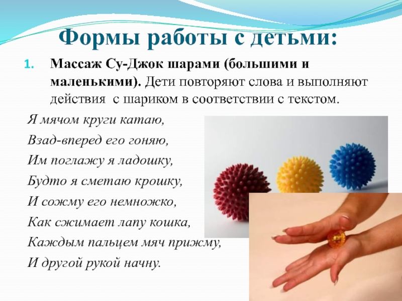 Она сопровождается чтением стихотворения. Дошкольники любят играть шариком с колючками. Прокатывая его между ладонями, они массируют слова и выполняют действия с шариком в соответствии с текстом: