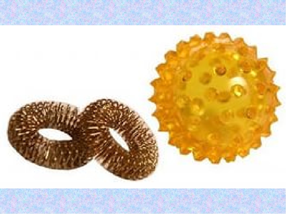 Массаж эластичным кольцом. Пружинные кольца надеваются на пальчики ребенка и прокатываются по ним. Массируется каждый палец до покраснения и появления ощущения тепла. Эту процедуру необходимо повторять несколько раз в день. С помощью шариков – «Ёжиков» с колечками – детям массируют пальцы и ладони, что оказывает благотворное влияние на весь организм, а также на развитие мелкой моторики рук. Все это способствует развитию речи. Чтобы процесс массажа не показался скучным, используется стихотворный материал.