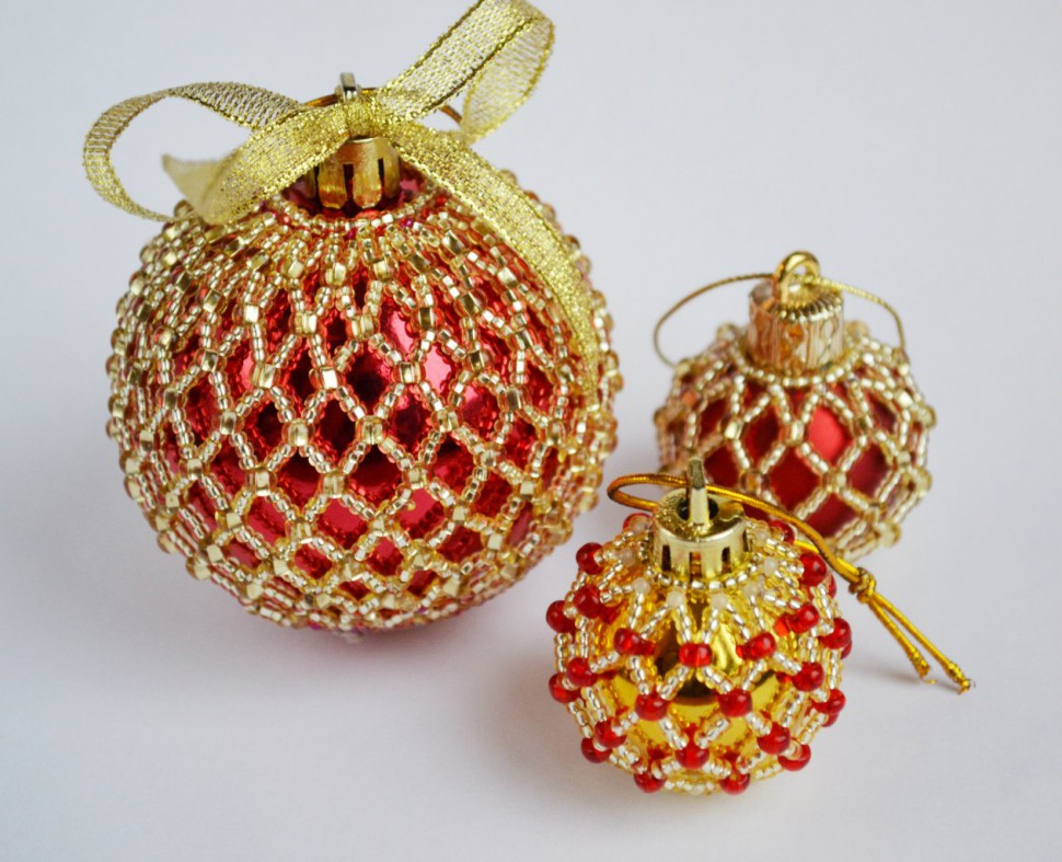 Из шнура и бусин. Один из самых простых способов декора новогодних шаров — обклеивание пенопластового шара нитками или декоративными шнурами. Чтобы шар выглядел более празднично, возьмите нитку бусин и приклеивайте их чередуя со шнуром, чередуя между собой. Воспользуйтесь прозрачным клеем «Момент».
