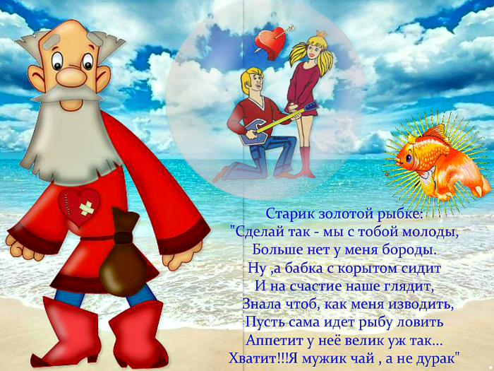 «Простите меня, Ваше Величество Золотая Рыбка! Моя старуха безумнее, чем когда-либо, Она не дает мне покоя ни на секунду, Говорит, что устала быть крестьянкой, И хочет быть прекрасной дамой».![]()